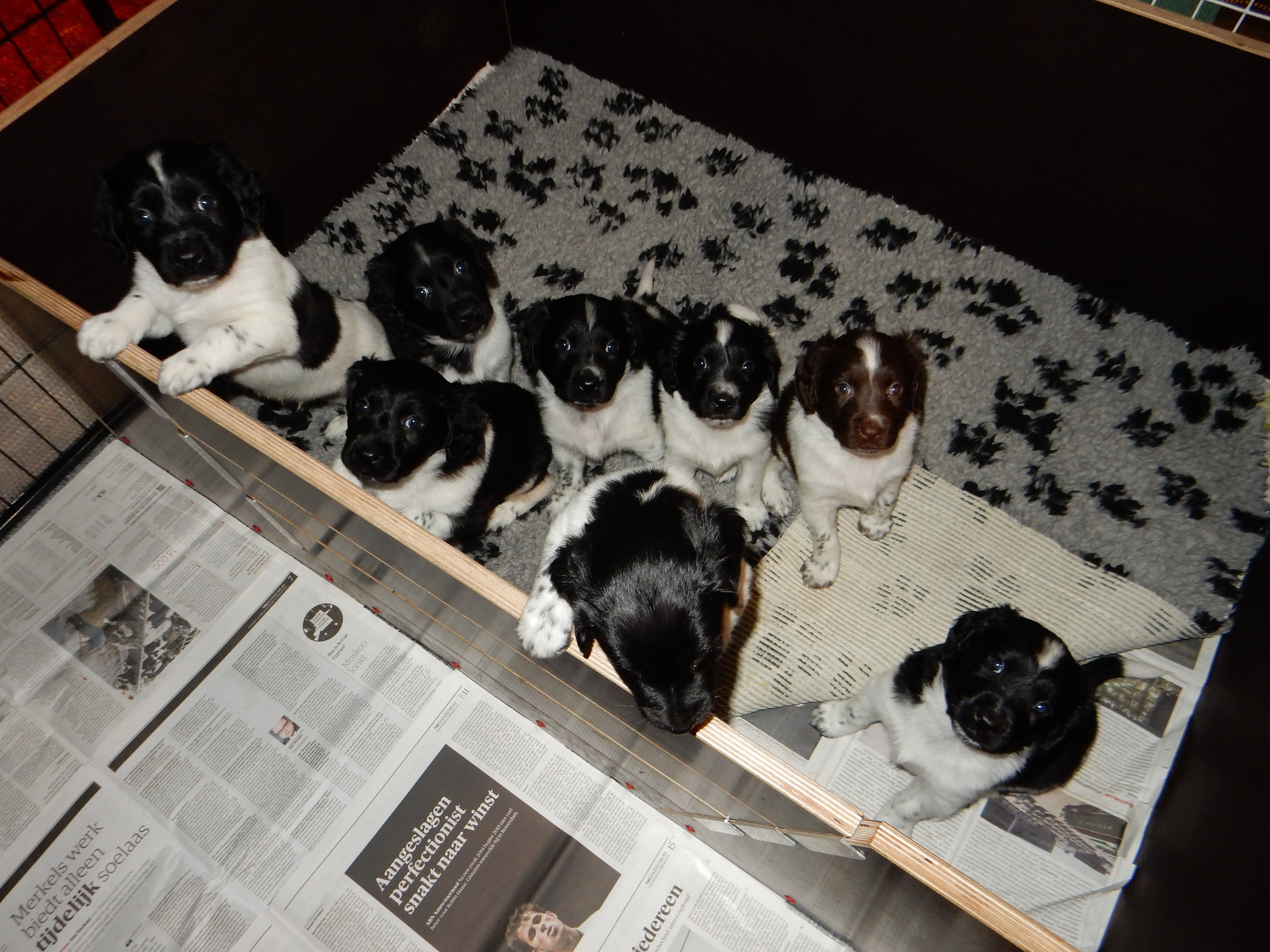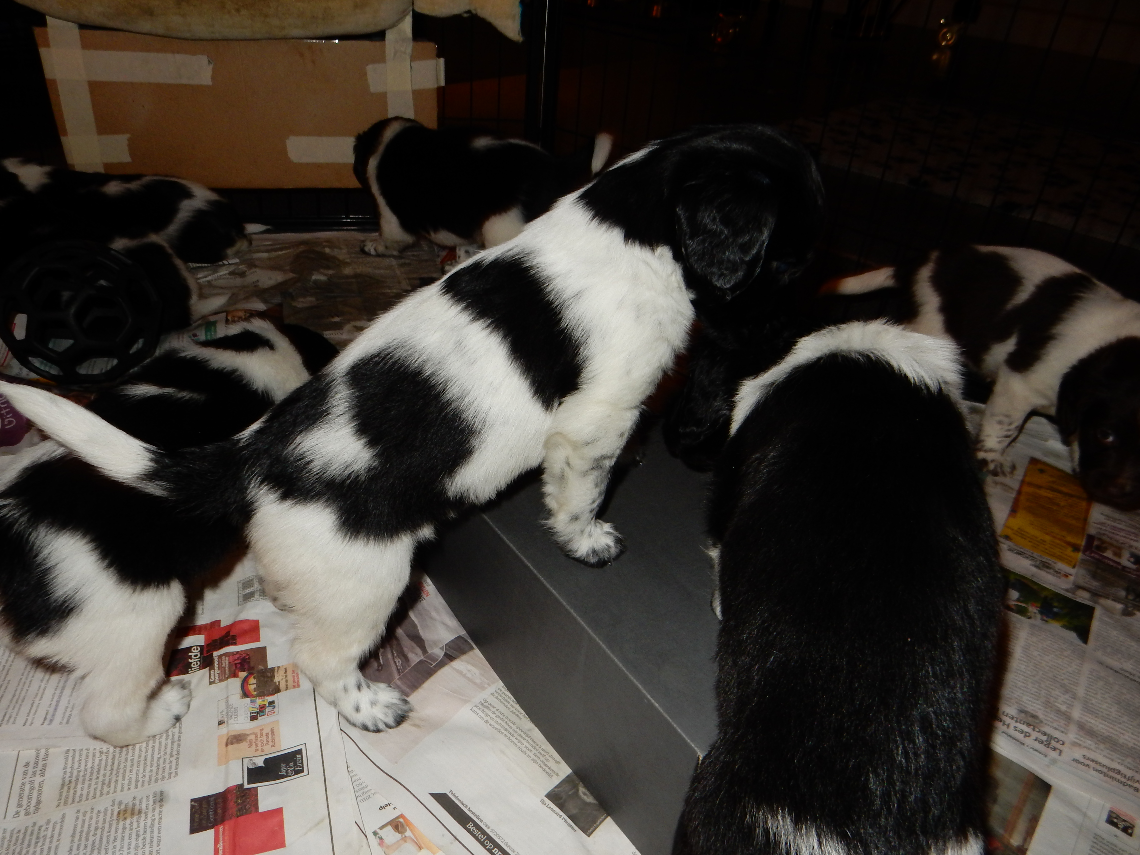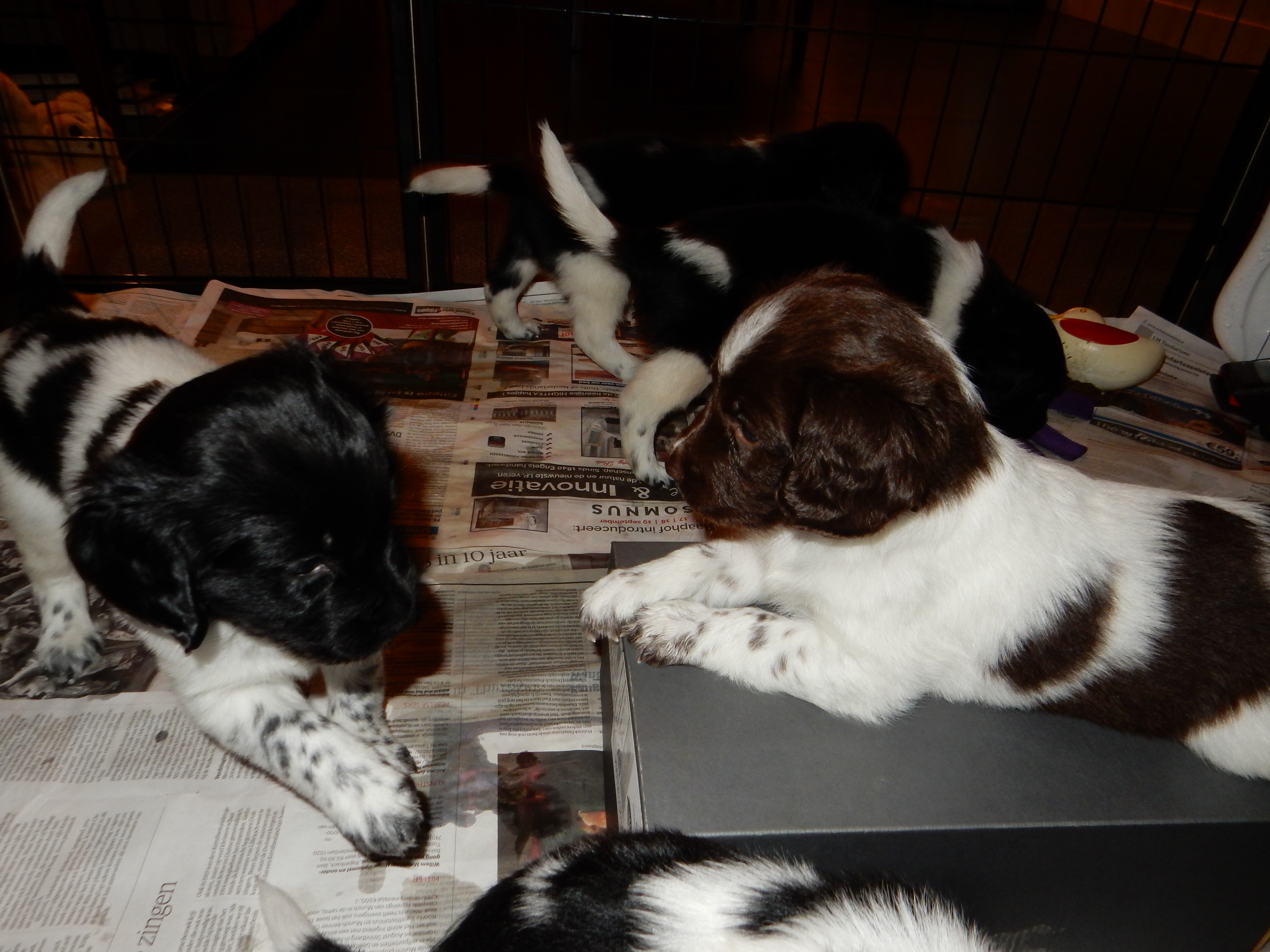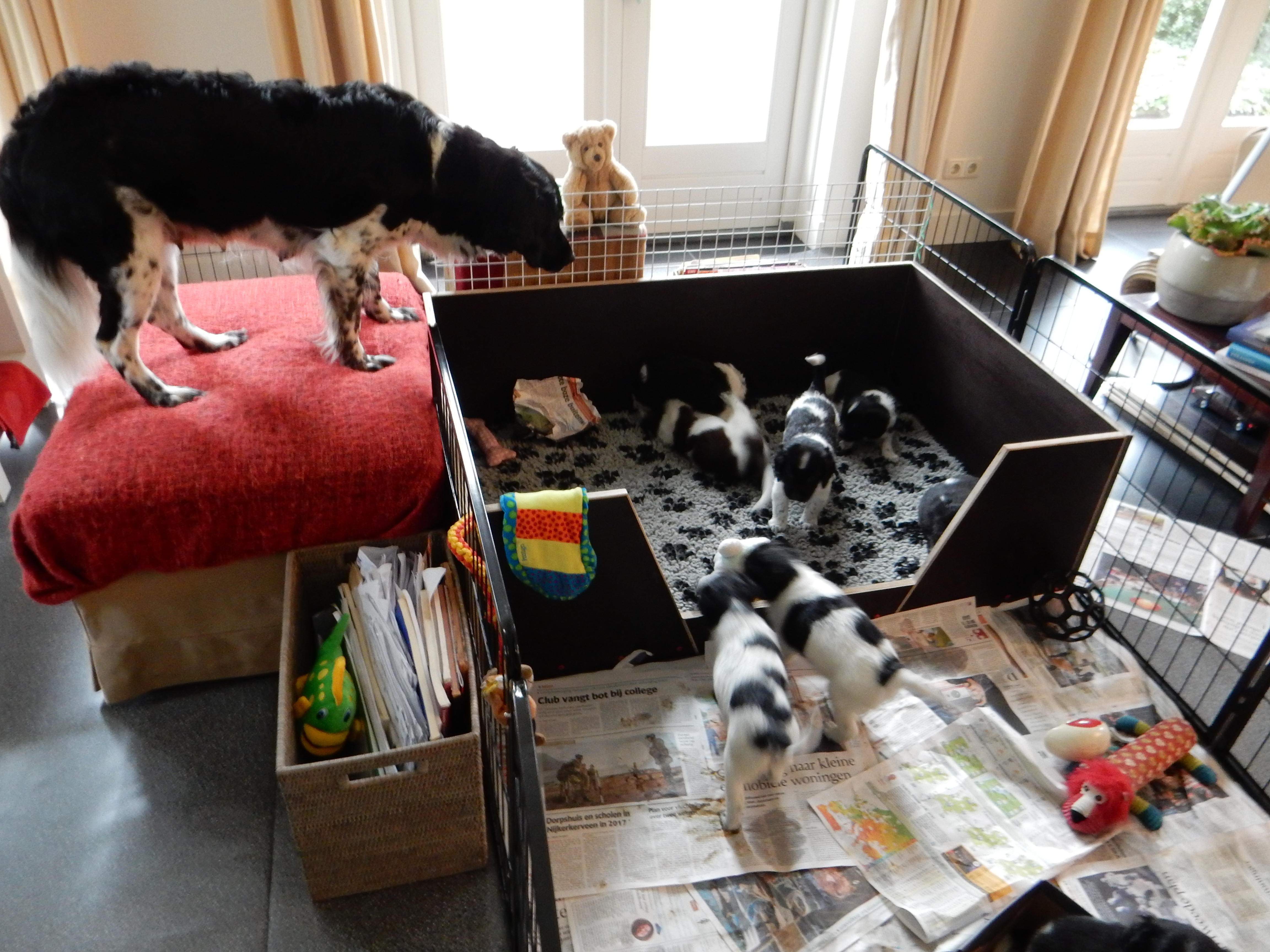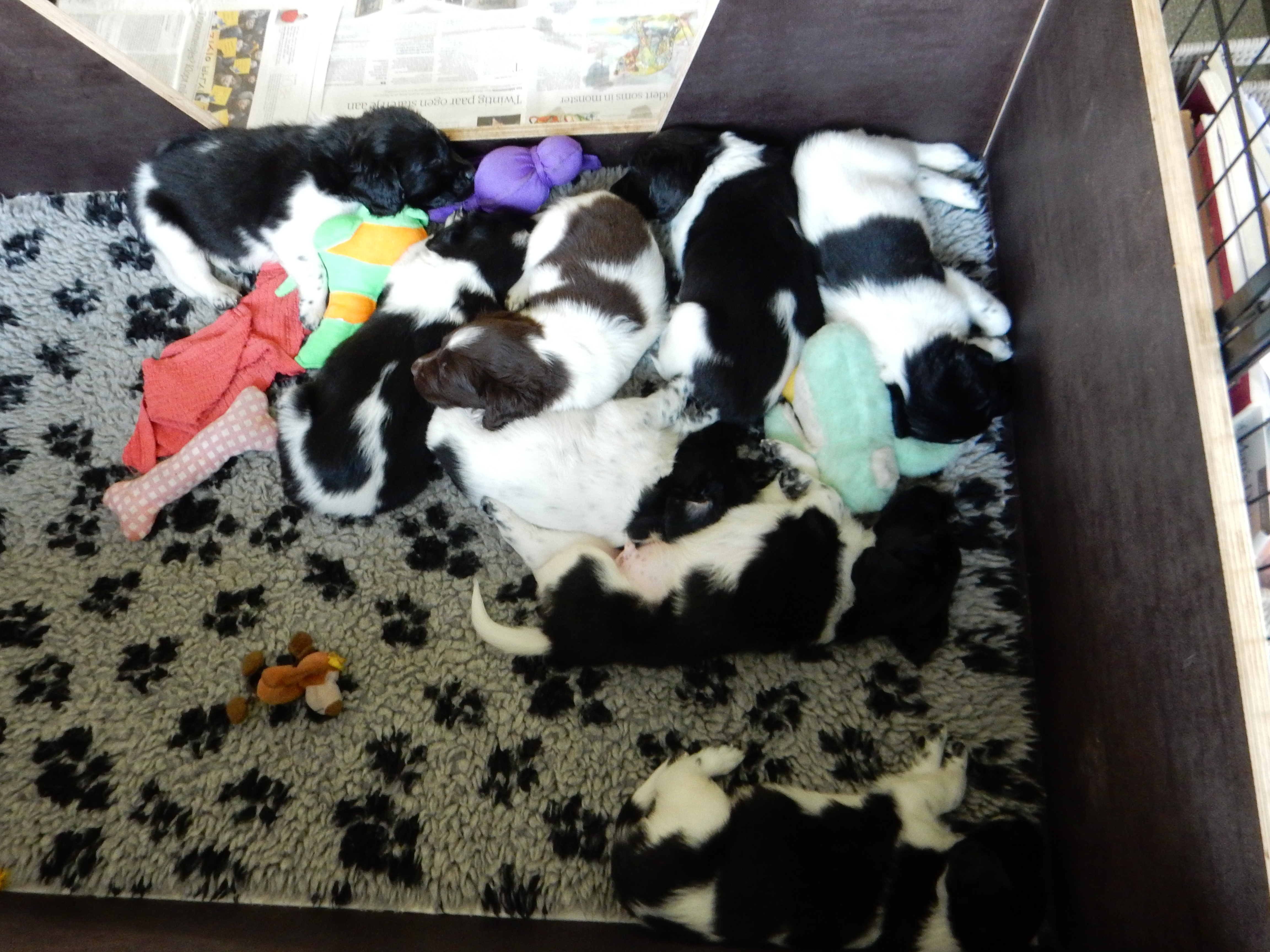 Gisteren hebben we ook de puppyren groter gemaakt. Ze hebben nu de werpkist om in te slapen, in de puppyren een deel met kranten om te plassen en te poepen, in de puppyren een deel zonder kranten om te spelen en de bench, zodat ze hier ook aan kunnen wennen en in kunnen slapen. De pups genieten erorm van de extra ruimte die ze hebben gekregen. Ze hebben nu alle ruimte om lekker heen en weer te rennen, te dollen en alles overhoop te halen.