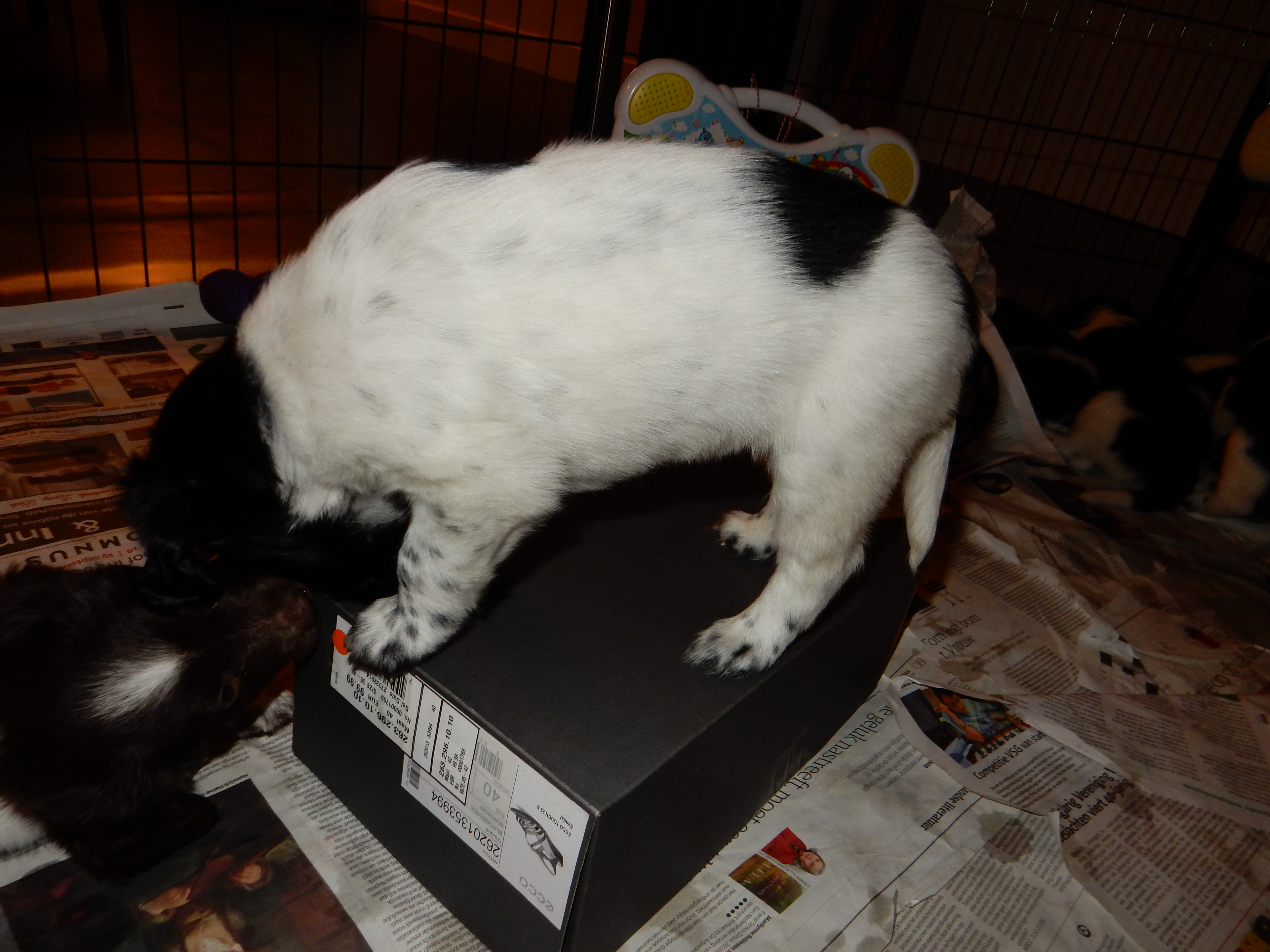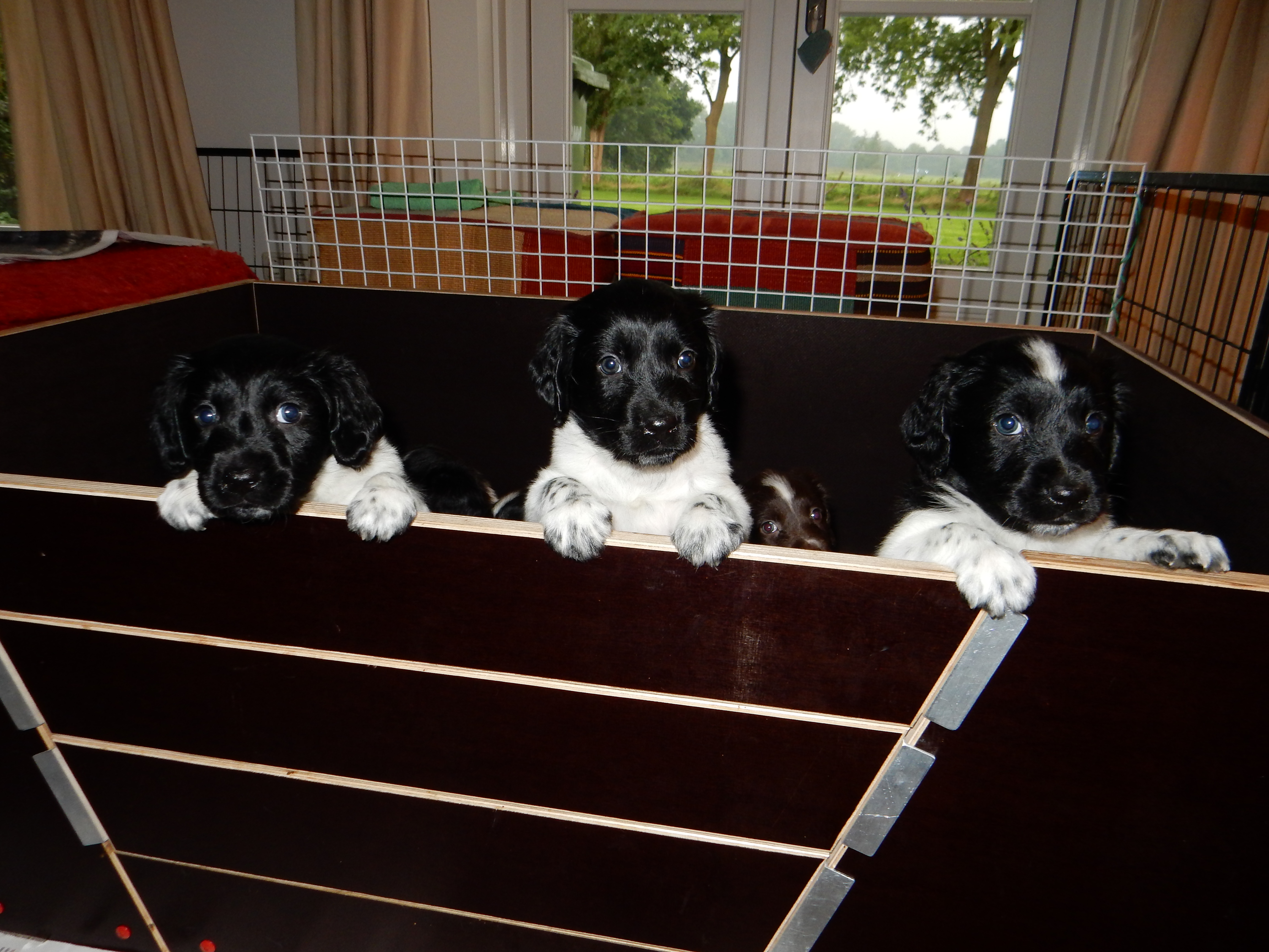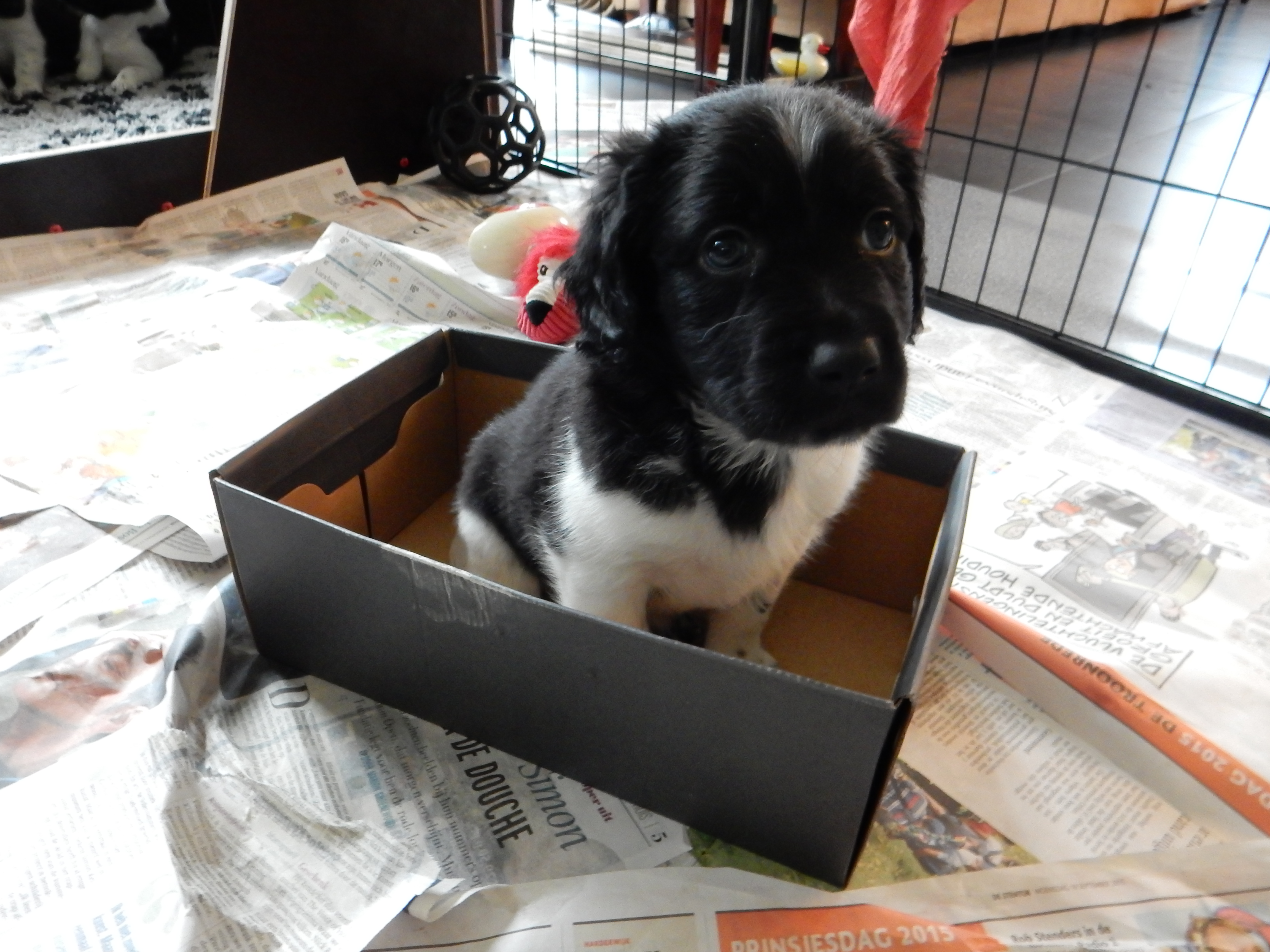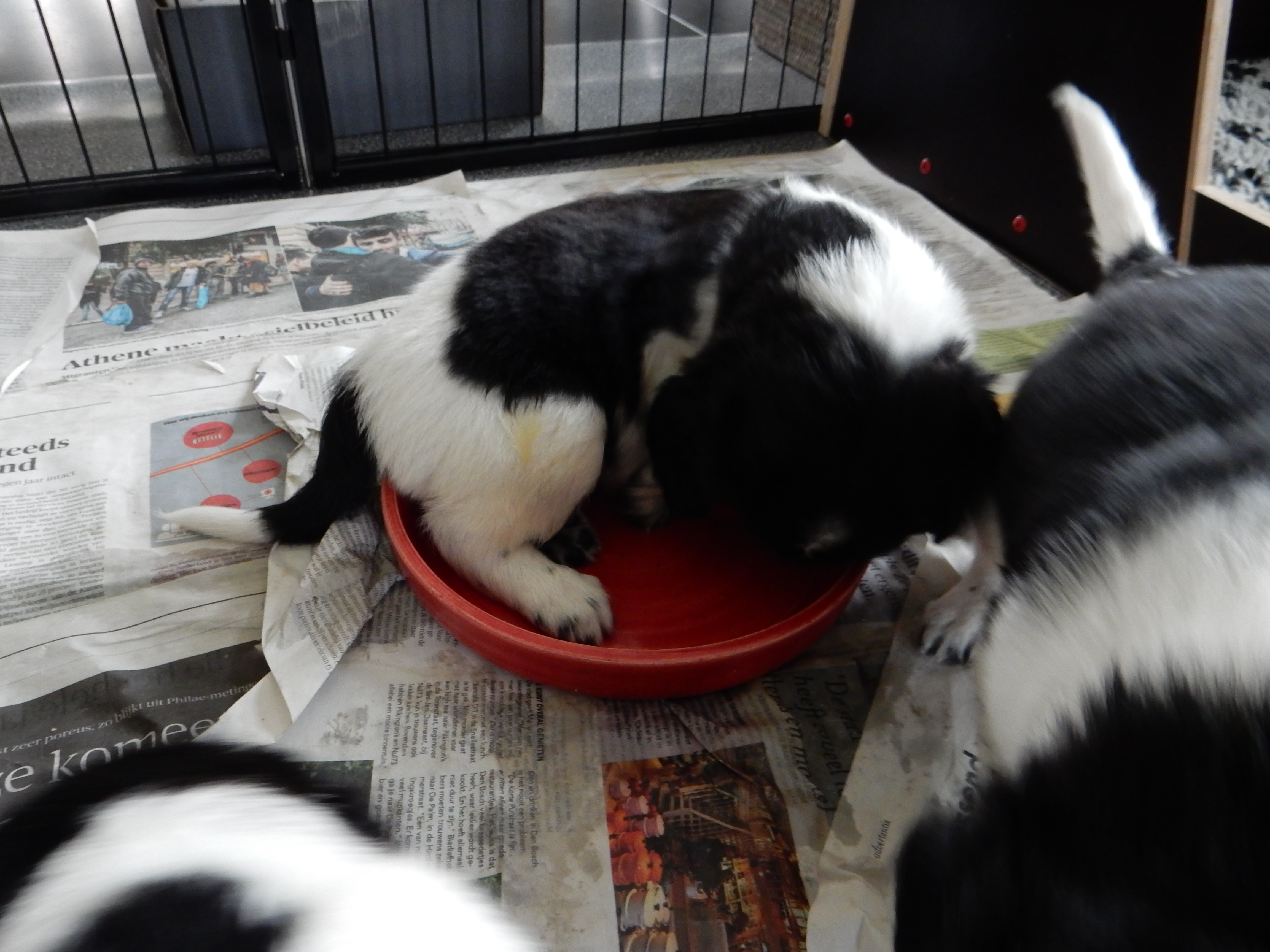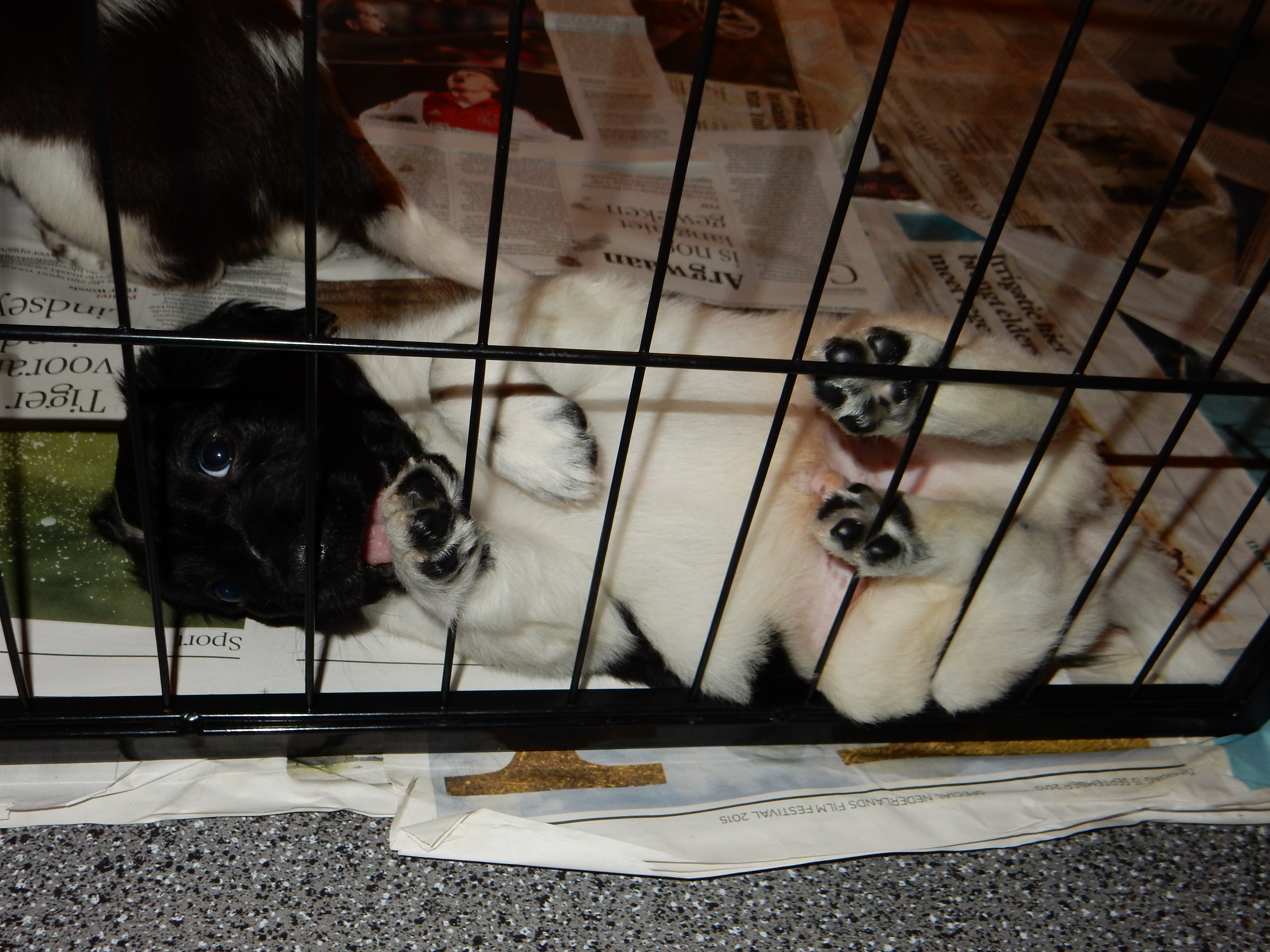 Gisteren hebben we ook de puppyren groter gemaakt. Ze hebben nu de werpkist om in te slapen, in de puppyren een deel met kranten om te plassen en te poepen, in de puppyren een deel zonder kranten om te spelen en de bench, zodat ze hier ook aan kunnen wennen en in kunnen slapen. De pups genieten erorm van de extra ruimte die ze hebben gekregen. Ze hebben nu alle ruimte om lekker heen en weer te rennen, te dollen en alles overhoop te halen.