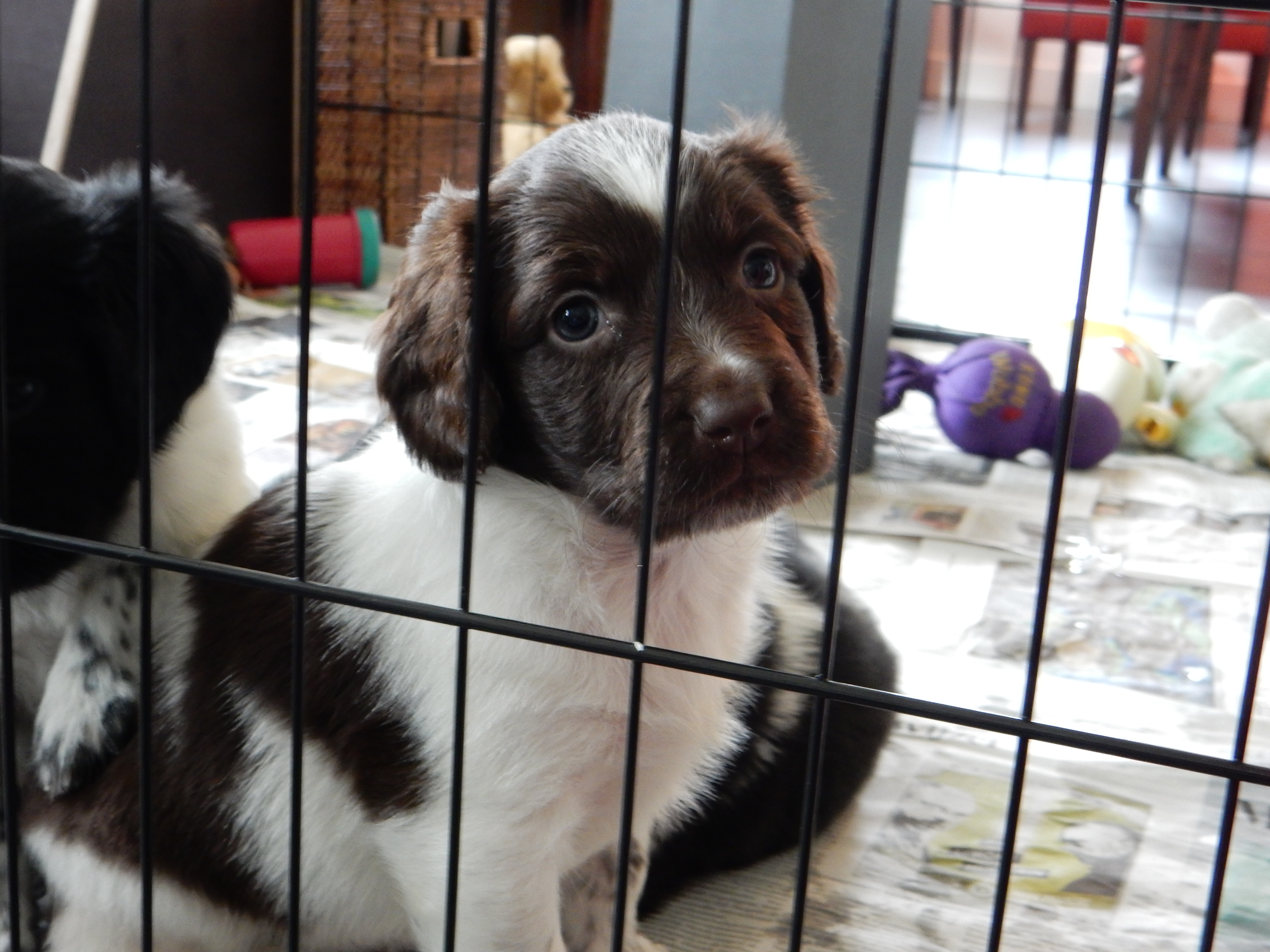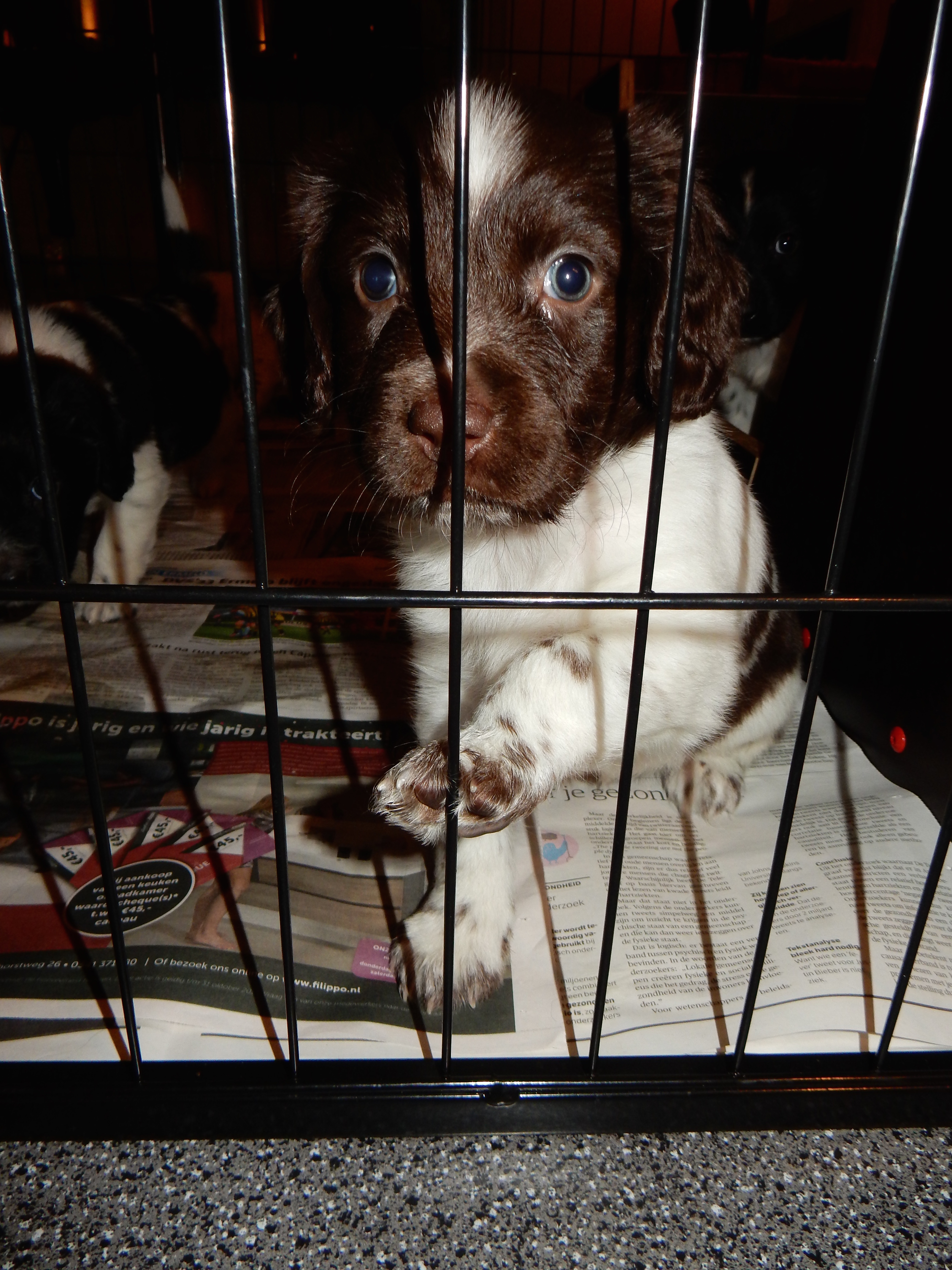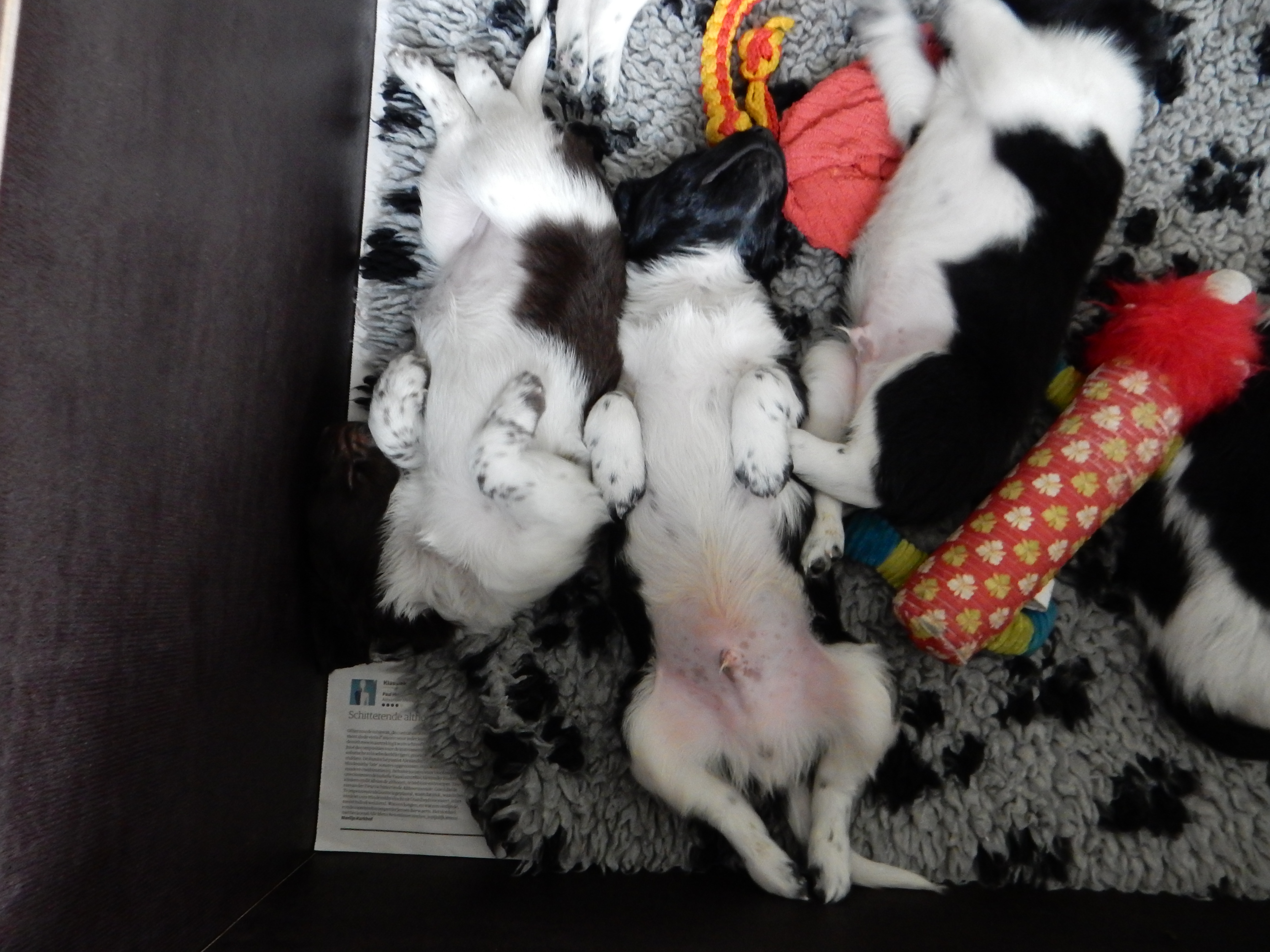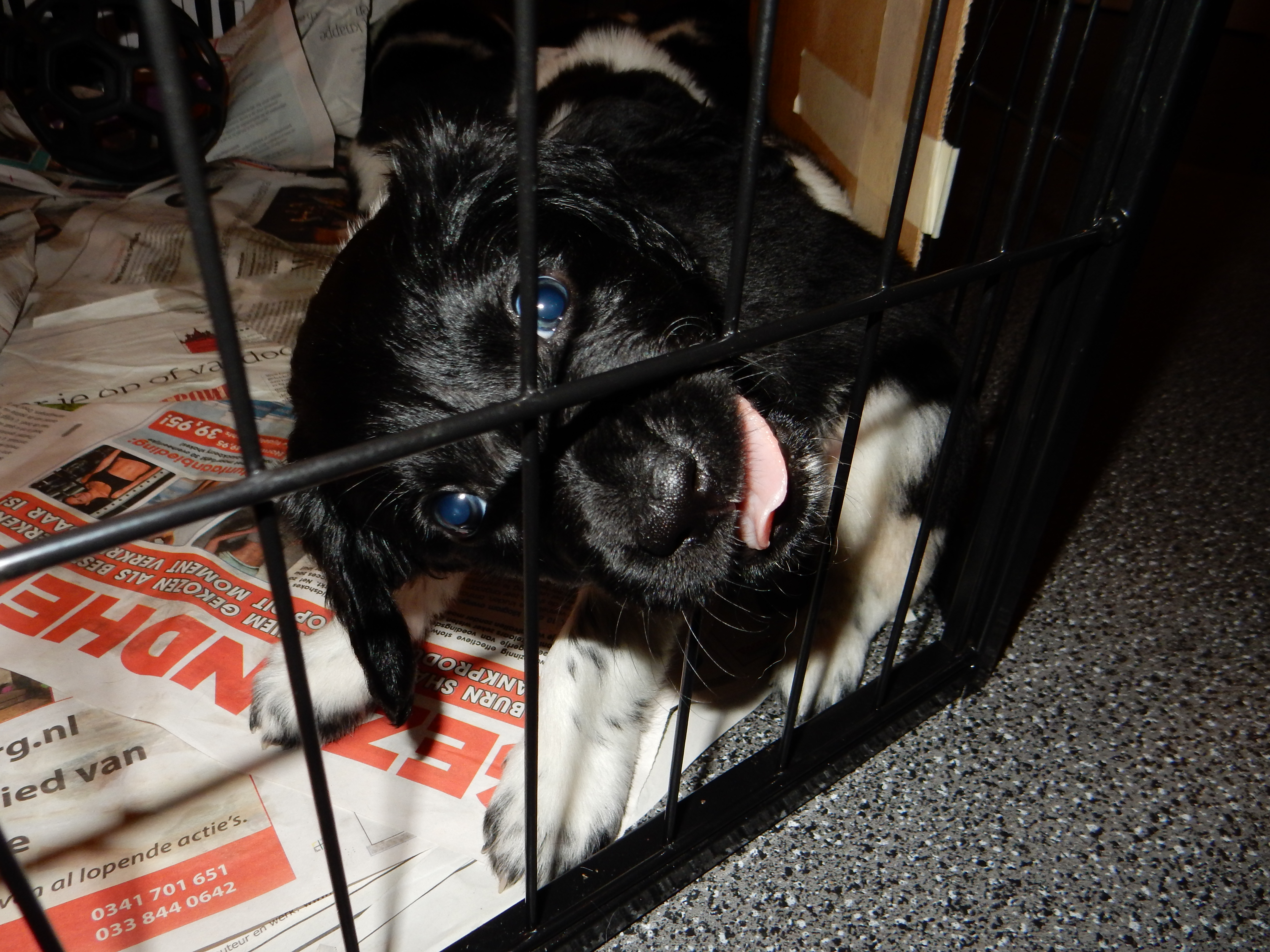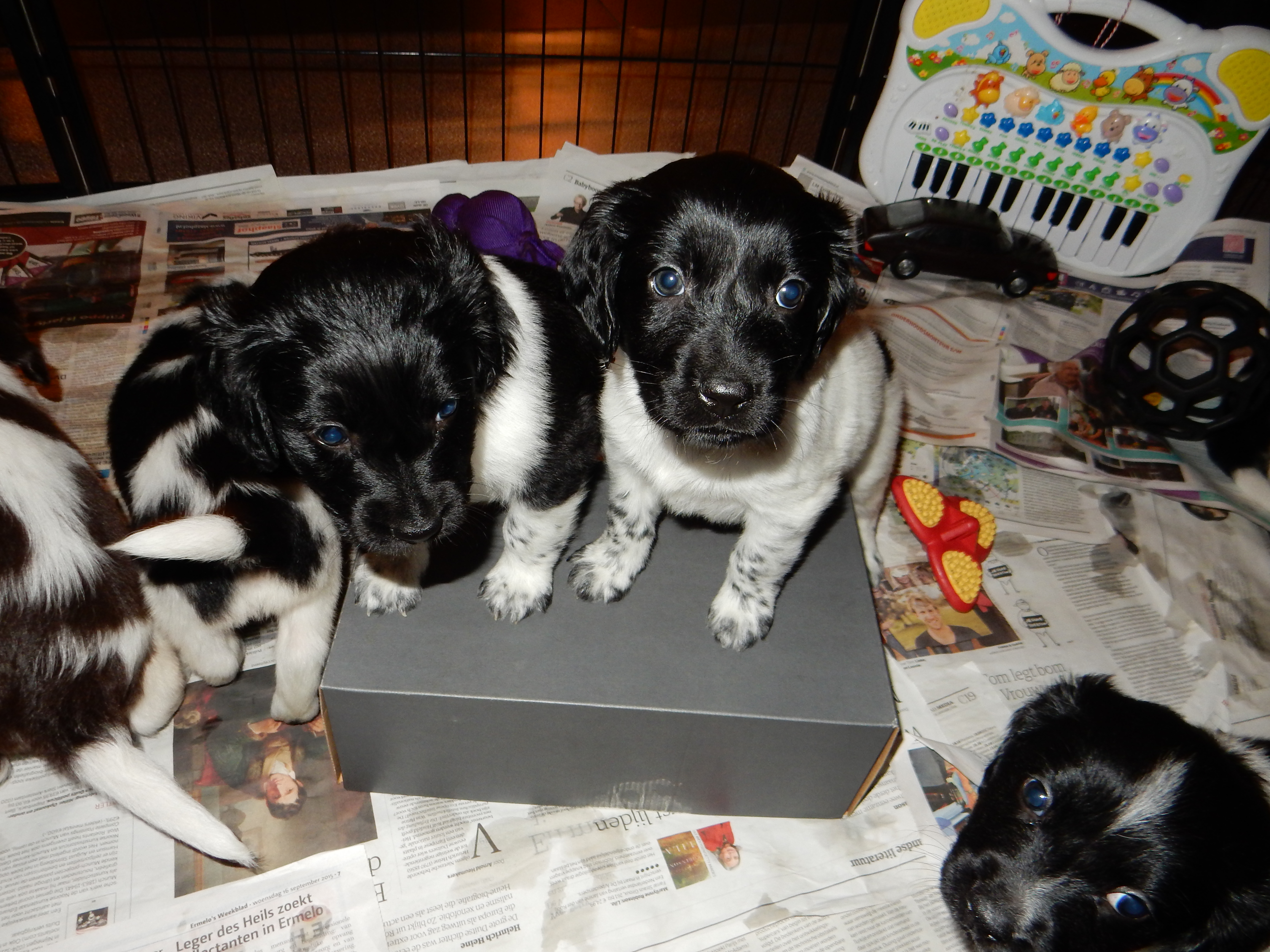 Gisteren hebben we ook de puppyren groter gemaakt. Ze hebben nu de werpkist om in te slapen, in de puppyren een deel met kranten om te plassen en te poepen, in de puppyren een deel zonder kranten om te spelen en de bench, zodat ze hier ook aan kunnen wennen en in kunnen slapen. De pups genieten erorm van de extra ruimte die ze hebben gekregen. Ze hebben nu alle ruimte om lekker heen en weer te rennen, te dollen en alles overhoop te halen.
