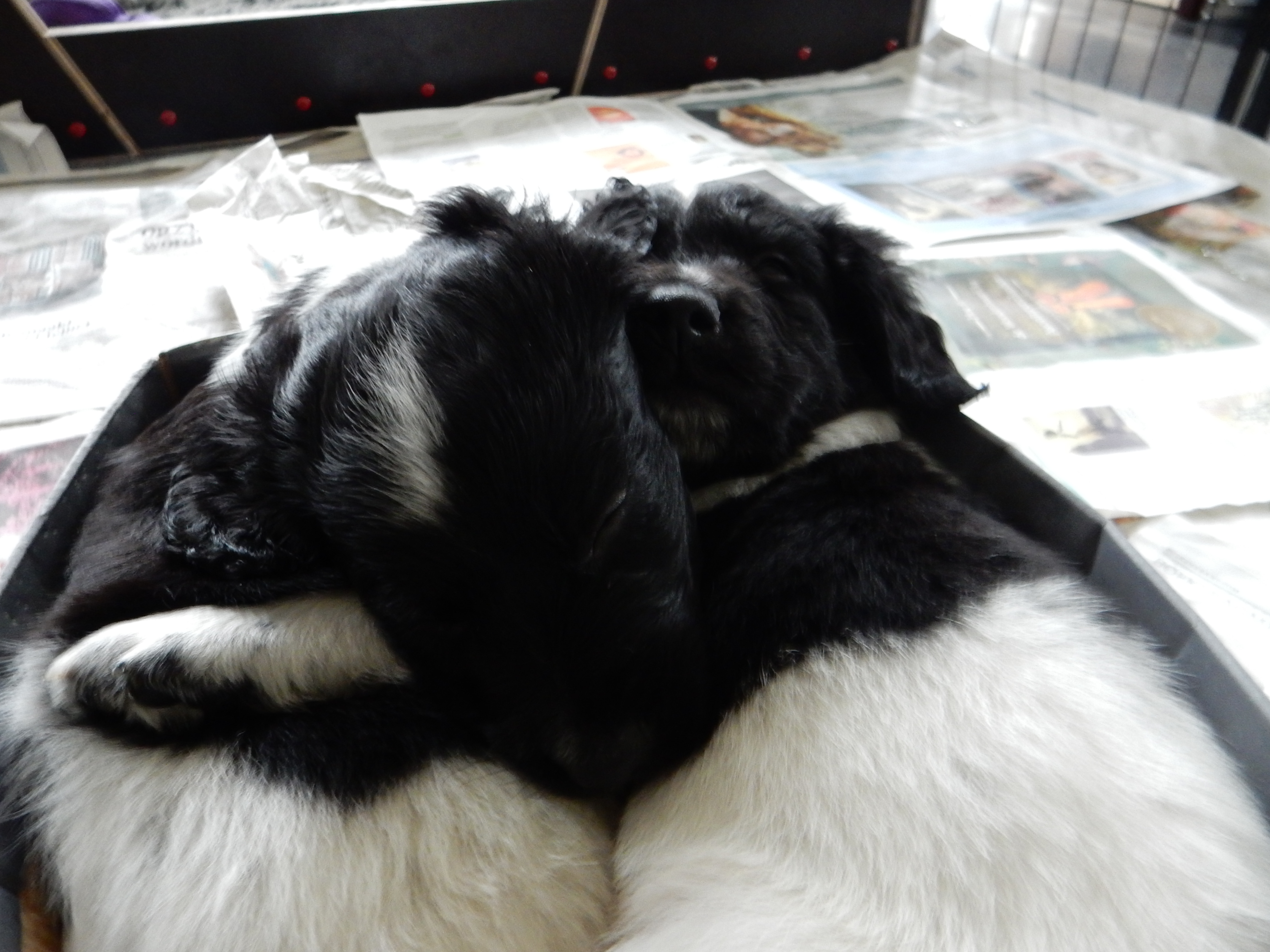 Na het bezoekje aan de dierenarts waren de pups bekaf. Op de terugweg lagen ze al gelijk te slapen in de doos en reisbench. Het waren veel nieuwe indrukken voor de pups!